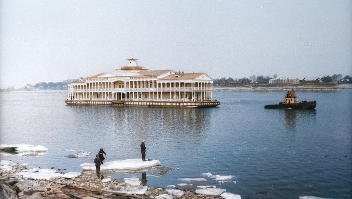 "Ураган" буксирует дебаркадер (плавучая пристань) к месту стоянки. Ярославская область, Рыбинск, 1971 год.