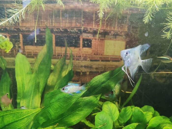 В данный момент у него несколько скалярий, 3 малька нанакары и одна взрослая, пара еллоу. Африка-Америка, всё вперемежку и всё хорошо. Территорию не делят, рыб помельче не едят.