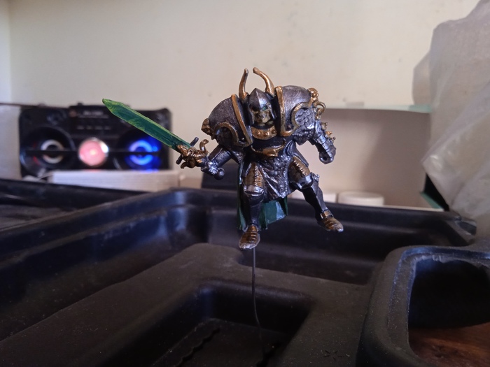 Так что я прошелся проливкой еще раз, покрыл миниатюру матовым лаком и прикрепил с помощью штифта из куска скрепки на базу.