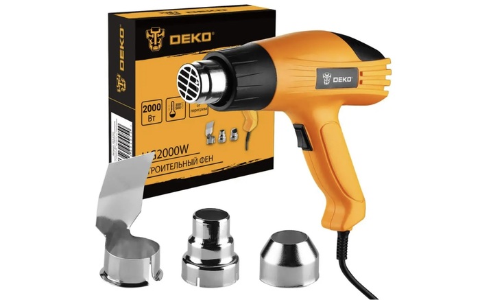 Один из полезных инструментов при ремонте - строительный фен. Отличается от бытового фена более высоким потолком температуры, а также повышенной мощностью. Я выбрал DEKO HG2000W на 2000Вт, так как в нем есть не только регулировка режимов, но и насадки в комплекте, а также защита от перегрева. В плюсах комплектации отмечу специальную насадку для термоусадки.