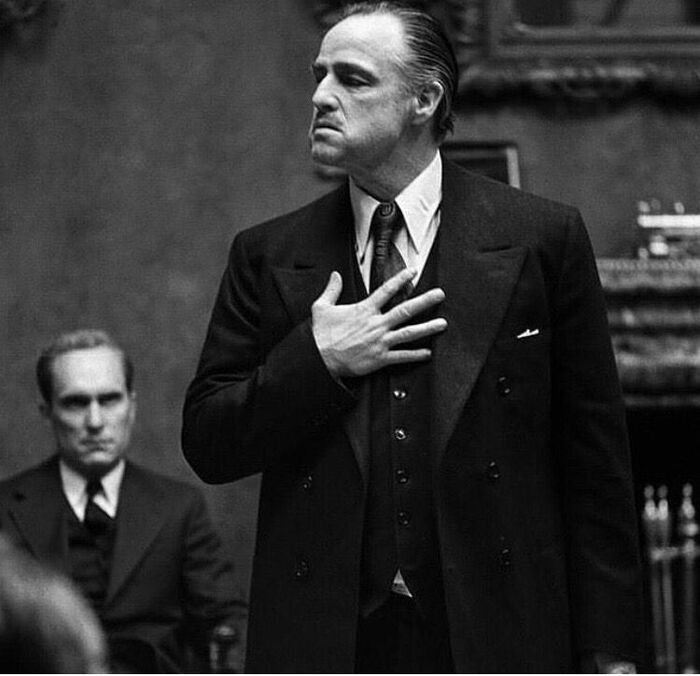 В начале «Собрания пяти семей» Вито Корлеоне начинает со слов — Как случилось, что дело зашло столь далеко? Это способ сказать Пяти семьям, что если им нужна была его помощь, они должны были попросить об этом лично до начала кровопролитных событий. Пока камера поворачивается, мы видим, как Филипп Татталья расчесывает остатки своих волос. Это способ Копполы изобразить легковесного лидера.