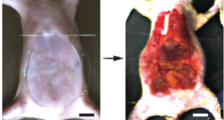 А дальше направили свет и оптику на это место. И кожа на несколько минут стала прозрачной (см.фото из научного журнала). Слева на картинке брюшко мыши под оптикой и светом, на котором ничего не видно. А справа брюшко с раствором, который сделал кожу прозрачной. На ней видно всю брюшную полость мышки-героини.