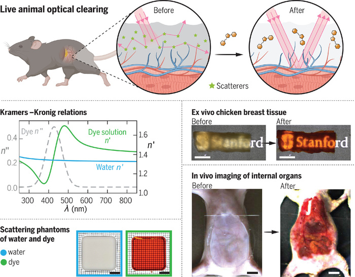 "Группа исследователей из Стэнфордского университета в США обнаружила, что обычный водорастворимый желтый краситель (среди нескольких других молекул красителя), который сильно поглощает ближний ультрафиолетовый и синий свет, может помочь сделать биологическую ткань прозрачной всего за несколько минут, тем самым позволяя свету проникать глубже. В испытаниях на коже, мышцах и соединительной ткани мышей, группа использовала эту технику для наблюдения за широким спектром глубоко расположенных структур и биологической активности. В своей работе исследовательская группа под руководством Цзыхао Оу (сейчас работает в Техасском университете в Далласе), Марка Бронгерсмы и Гуосуна Хонга натирала живот, кожу головы и задние конечности живых мышей обычным пищевым красителем татразином желто-красного цвета. Поглощая свет в синей части спектра, краситель изменял показатель преломления воды в обработанных областях на длинах волн красного света, так что он больше соответствовал показателю преломления липидов в этой части спектра. Это эффективно уменьшало контраст показателя преломления между водой и липидами и позволяло биологической ткани казаться более прозрачной на этой длине волны, хотя и с красным оттенком".