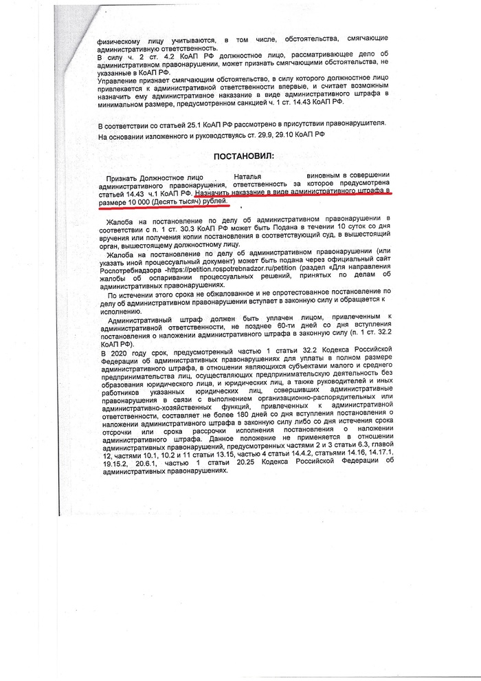 Итак, я дождался пока Постановление Роспотребнадзора будет рассмотрено в Арбитраже и по сути обвинений "засилено".