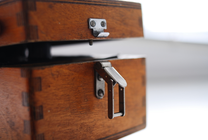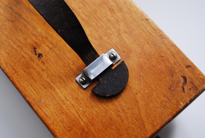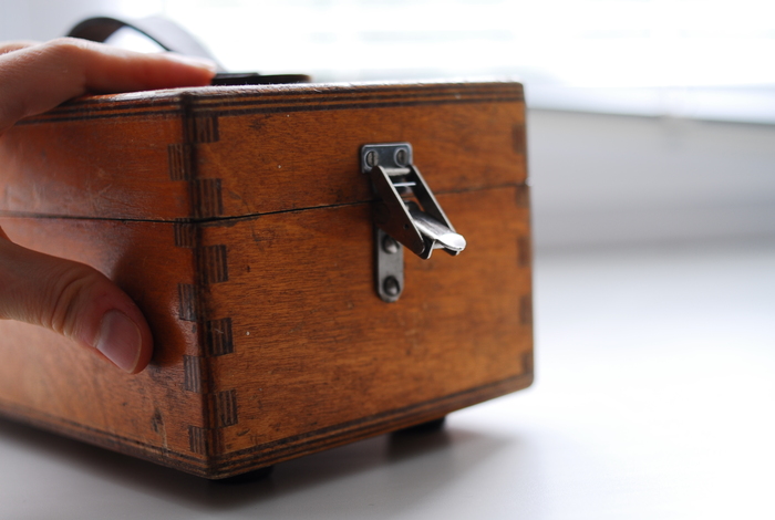 Размещается вот в такой минималистичной сумке, кожзам за сорок лет ни капли не потерял в качестве. Сумка просторная и удобная.