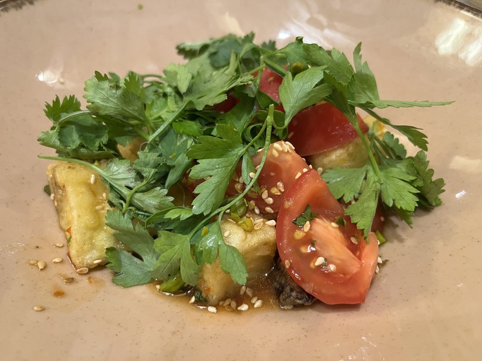 Но в эту подборку, пожалуй, я включу самое неочевидное блюдо – хрустящие баклажаны с томатами за 350 рублей.