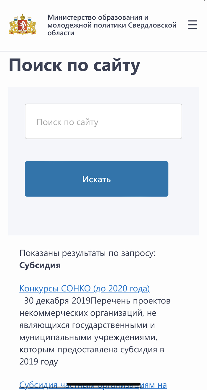 На сайте в поисковой строке (ниже на фото укажу в какой именно) вводите одно из слов: грант, субсидия. Важно! Если ничего не выдаётся - попробуйте другой падеж выбранного вами слова. Поисковики министерств считают это за отдельное слово. И не нужно вводить целыми фразами. Эти поисковики к такому не сильно готовы.
