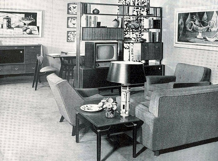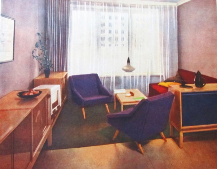 В конце 50-х в СССР началось массовое строительство жилья. Хрущевские квартиры по сравнению со "сталинками" были компактнее, высота потолков требовала новых решений в организации пространства. И тогда СССР обратил внимание на западный стиль Mid-century modern. Заграничные образцы сначала появились в выставочных павильонах, а вскоре советские фабрики начали выпускать свои аналоги.