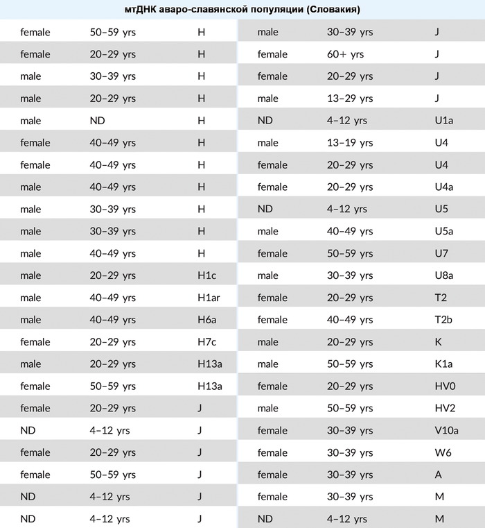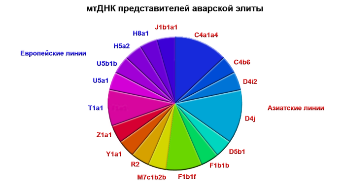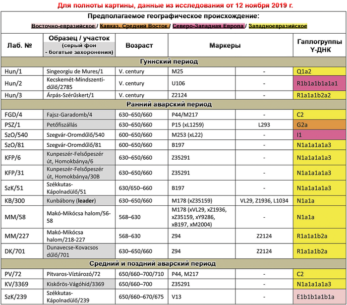 В то время как в позднеаварском периоде количество этой родословной сократилось уже до 70-80%. Остальная часть родословной происходит от источника, несущего более высокое западноевразийское происхождение. За исключением двух поздних обитателей междуречья Дуная и Тисы, носителями этого западноевразийского происхождения в равной степени могут быть как жители причерноморско-каспийских степей, так и популяции Карпатского бассейна IV-VI веков.