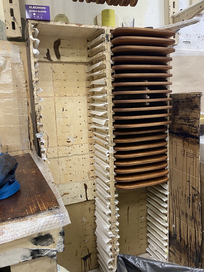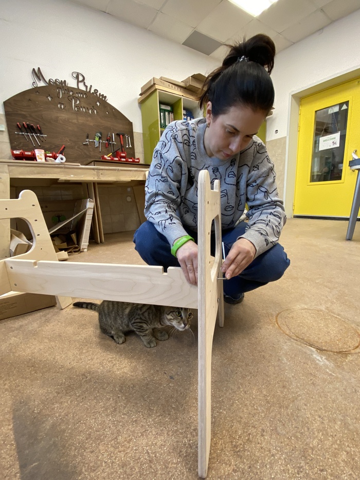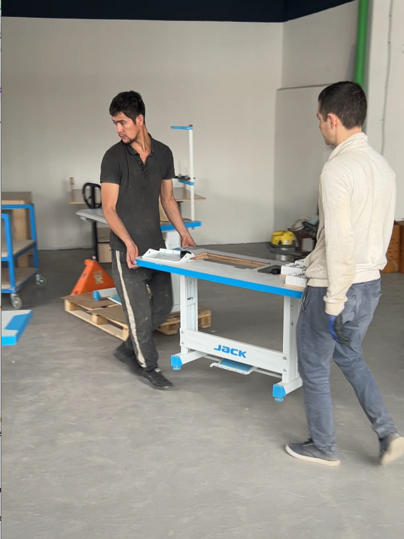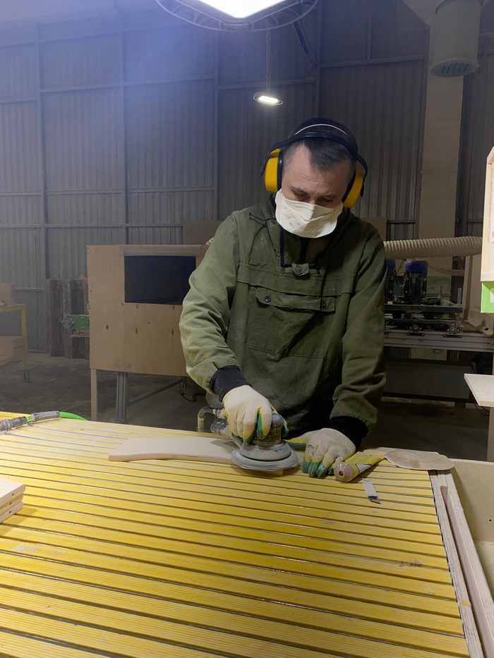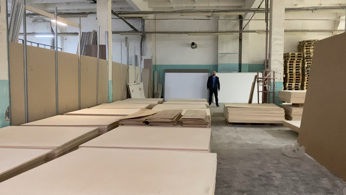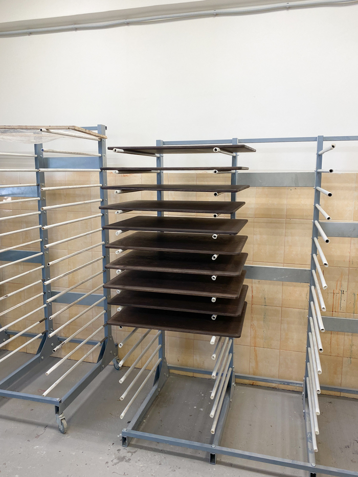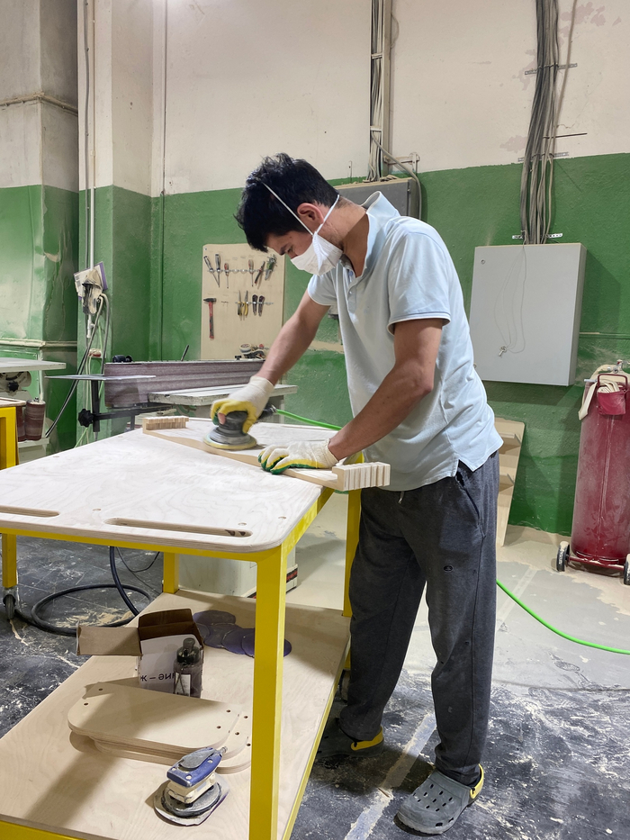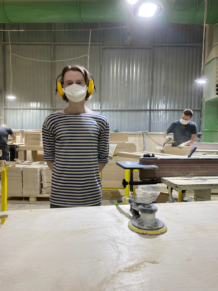 Столы сделаны из нашей же бракованной фанеры, столешниц и других деталей, которые не прошли контроль качества. В производстве они уже не пригодятся, но используем их часто для нужд производства. Столы мобильные и легкие - можно быстро установить и убрать.