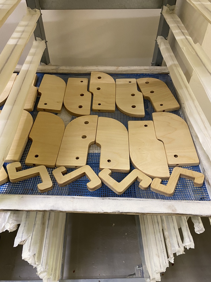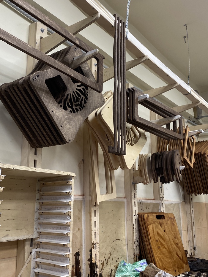 У нас больше 30 моделей мебели, и самая продаваемая модель - это растущий стульчик. В месяц производим их в среднем по 5000-6000, в каждом стуле 11 деталей, среди которых сидушки и ножки. Для них сделали отдельные стеллажи. Они подогнаны под размер, чтобы детали свободно входили и не падали, а покрытие не стиралось.
