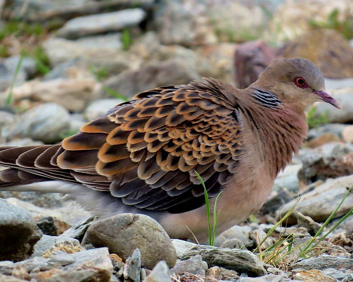 Яркое "зеркальце" по бокам шеи - отличительная черта этих птиц. Его нет у молодых горлиц, окрас которые в целом более бледный.