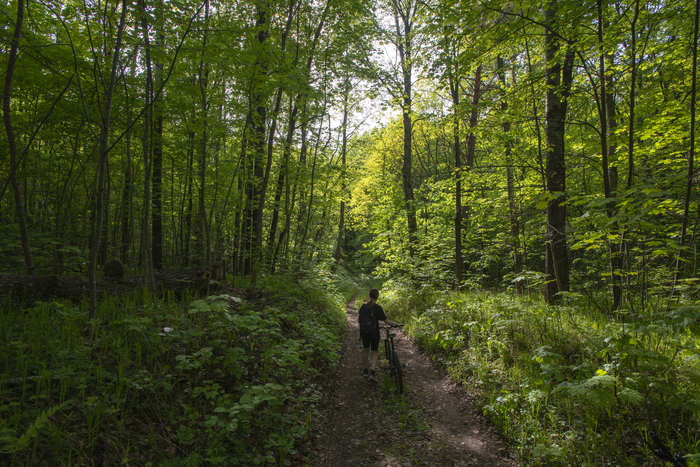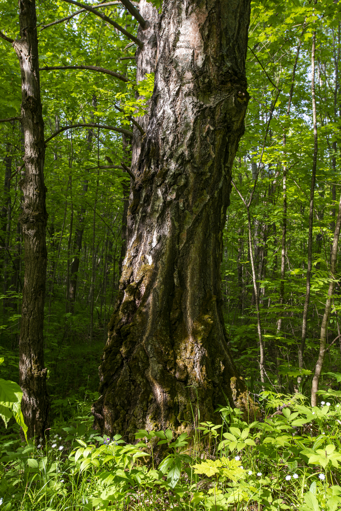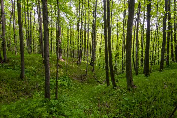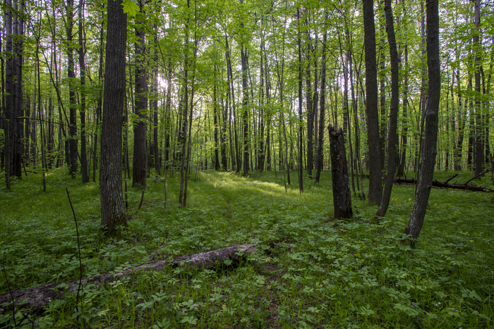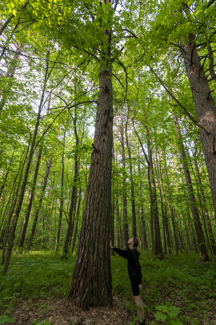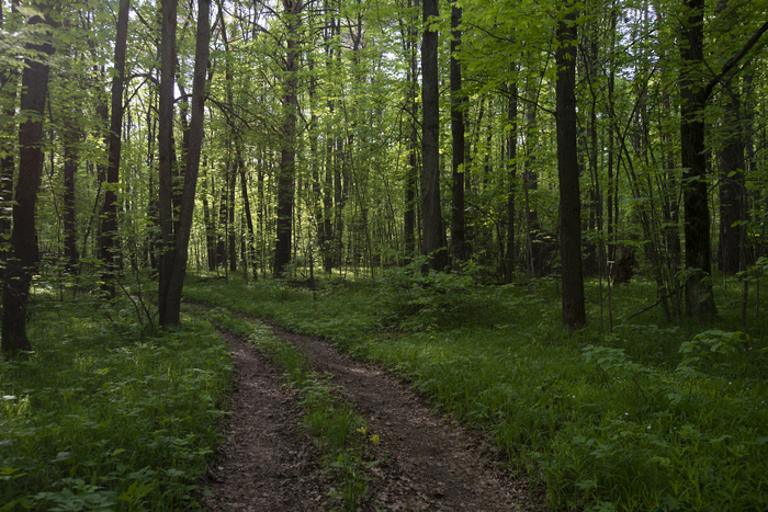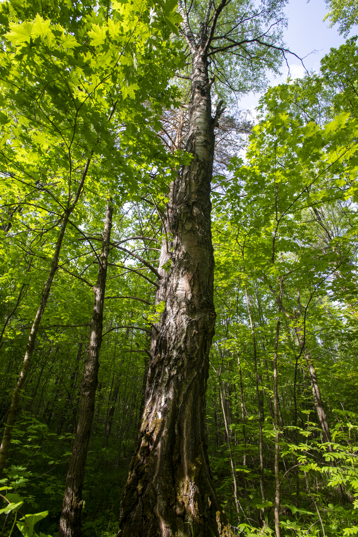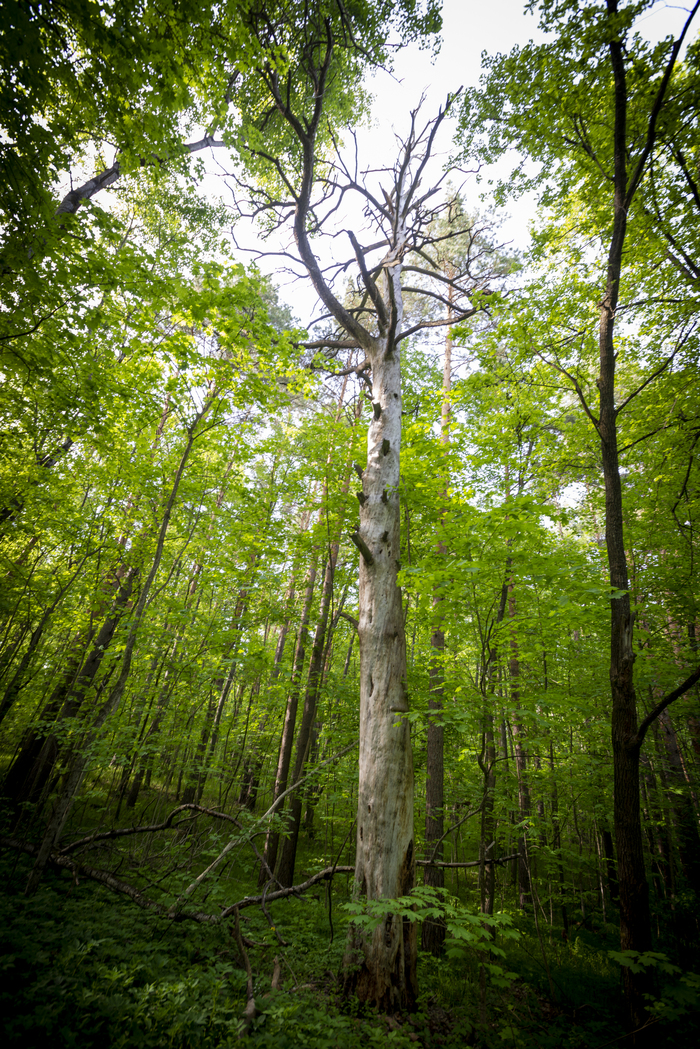 Немного углубившись в лес мы решили оставить велосипеды и пройтись пешком. Лес мягко обволакивал тенью, щебетом птиц и смесью запахов свежей и прошлогодней перепревшей листвы. Среди молодых дубов и берёз нас встречали и настоящие исполины - берёзы, осины, сосны... И, хотя некоторые из них уже отжили свой век, но их остовы стоят, будто памятники былой мощи, возвышаясь над древесной молодёжью.