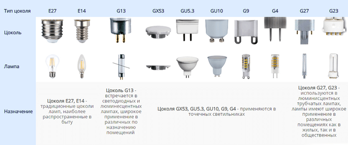 Теперь рассмотрим цоколь лампочки, в бытовом использовании распространены следующие цоколи (см. фото)