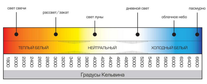 Цветовая температура – показывает каким цветом будет светить наша лампа. Например 1800К – будет светить желтоватым цветом, более «теплым», а 6000К – белым цветом «холодным».