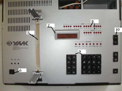 В состав УМК входят пластмассовый корпус (1), источник питания (2), модуль центрального процессора (ЭВМ) (3), клавиатура (4), разъем для подключения макетной платы (5) и макетная плата. На горизонтальной панели прибора расположены кнопка включения питания (6), шесть семисегментных индикаторов, составляющих дисплей и отображающих шестнадцатеричные код адреса и значения данных (7), информационные светодиодные индикаторы (8), набор кнопок клавиатуры оператора (9), кнопки переключения режима работы (10).