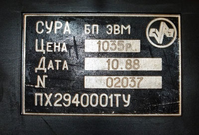Шильдик от «Суры» ПК8000: по цене это были самые дорогие из домашних ПК советской разработки (дороже стоили только многие аналоги «Спектрума»). Причём это цена ещё не максимальная – «Хобби» ПК8000 в начале 90-х стоил 1152 рубля. Шильдик красноречиво сообщает и о весьма скромных объемах выпуска «Суры» – в октябре 1988 года серийный номер всего лишь 2037, хотя ПК выпускался с 1987 года