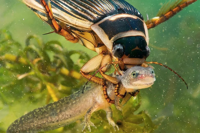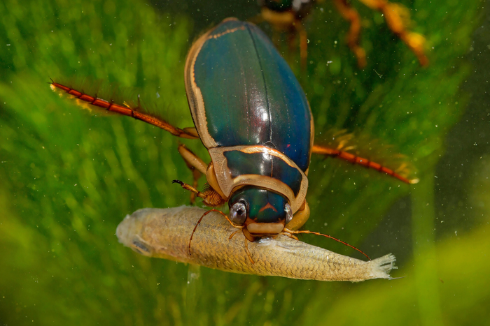 Сцапав цепкими передними лапками жертву, он безо всякого сочувствия отрывает мощными челюстями кусок за куском от ещё живой трепыхающейся добычи. Охотятся плавунцы на водных беспозвоночных, мальков рыб, а самые крупные особи – даже на лягушек и тритонов, так что жестокая жучиная трапеза начинается и заканчивается под водой. Но как же дышать? А дышать как раз выставленной наружу попой!