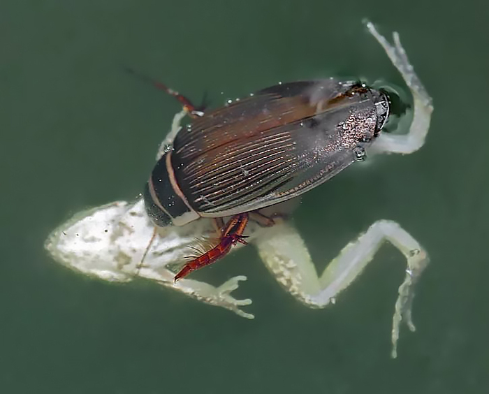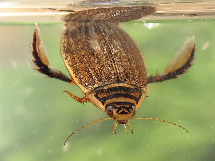 Вот и получается, что когда большая часть жука-плавунца пребывает под водой, его попа активно насыщает организм кислородом, проветривая систему трахей через брюшные дыхальца. Но сразу возникает вопрос: а не приметит ли эту дрейфующую пятую точку какая-нибудь пролетающая мимо голодная птица и не съест ли его крупная рыба в тот момент, когда он так увлечён собственным обедом? Неужели жук такой дурачок, что так беззаботно подставляется?