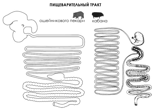 Как пекари расправляются с жёсткими колючими кактусами мы разобрались, но откусить-то кактус мало, его нужно ещё и переварить, и этому способствует мощный трёхкамерный желудок, приспособленный к перетиранию грубой пищи. В переднем отделе желудка имеются два колбасовидных слепых мешка, предназначенных для предварительной обработки и ферментации пищи, вот и получается, что хотя пекари и не являются истинными жвачными, их желудок по функциональности занимает промежуточное положение между желудками свиней и жвачных животных.