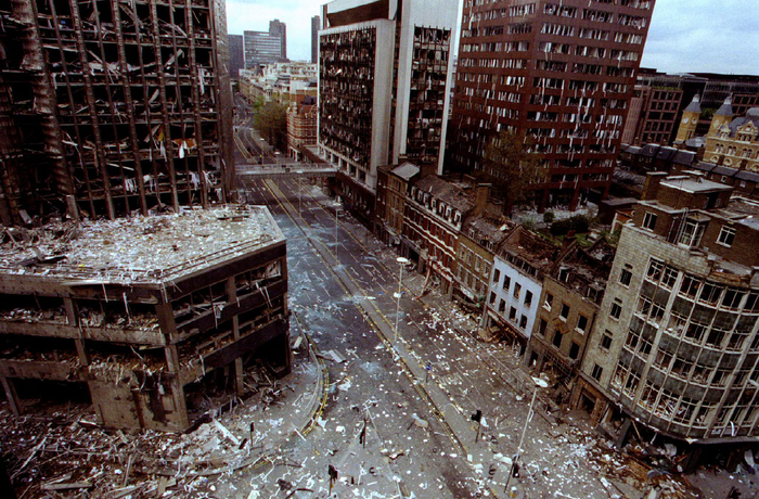 Бомба повредила район взрыва в лондонском Сити после того, как 24 апреля 1993 года в этом районе прогремели два взрыва. Грузовик с бомбой был частью кампании ИРА по принуждению британского правительства к выводу войск из Северной Ирландии. REUTERS/Andre Camara