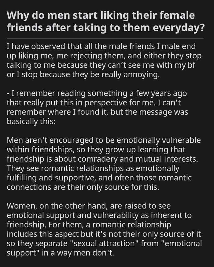 У мужчин не в чести быть эмоционально уязвимыми в дружеских отношениях, поэтому они взрослеют, понимая, что дружба - это товарищество и взаимные интересы. Они рассматривают романтические отношения как эмоционально насыщающие и поддерживающие, и часто эти романтические связи являются их единственным источником для этого. С другой стороны, женщин воспитывают с ощущением, что эмоциональная поддержка и уязвимость присущи дружбе. Для них романтические отношения включают в себя этот аспект, но это не единственный их источник, поэтому они отделяют "сексуальное влечение" от "эмоциональной поддержки" так, как этого не делают мужчины.