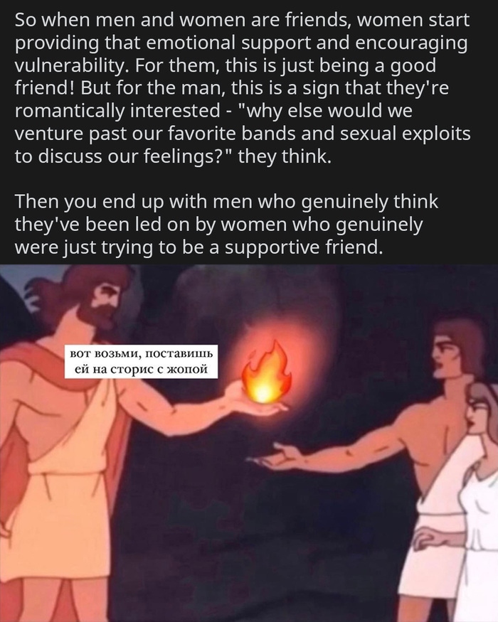 Поэтому, когда мужчины и женщины дружат, женщины начинают оказывать им эмоциональную поддержку и поощрять уязвимость. Для них это просто значит быть хорошим другом! Но для мужчины это признак того, что они романтически заинтересованы - "иначе зачем бы мы рискнули оставить в стороне наши любимые группы и сексуальные подвиги, чтобы обсудить наши чувства?". Так они думают.