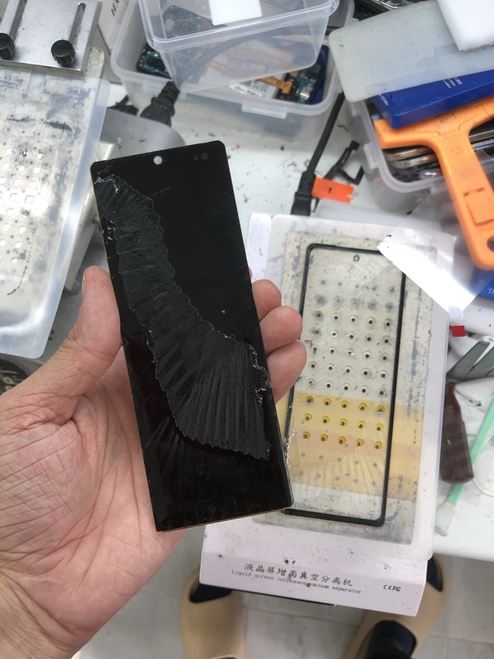 Думаете, это единичный случай? А вот и нет, потому что на следующий день принесли такой же трубошлеп, у которого дисплей разорвало настолько, что он вообще перестал показывать)