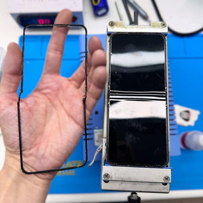 Затем медленно снимаем пластиковые рамки с экрана, которые сидят на жестком герметике.