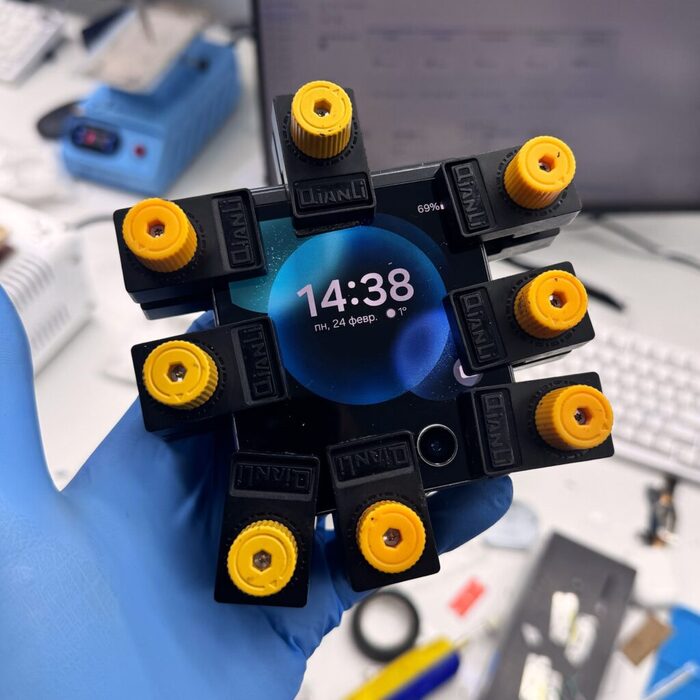 Заклеиваем внешний дисплей на дорогущий термоклей и собираем раскладушку обратно.