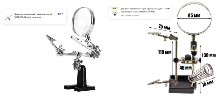 Вариант дешевле - паяльная лупа "третья рука" (лупа + зажимы)