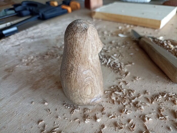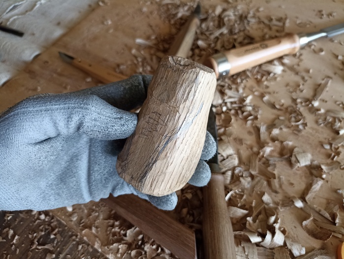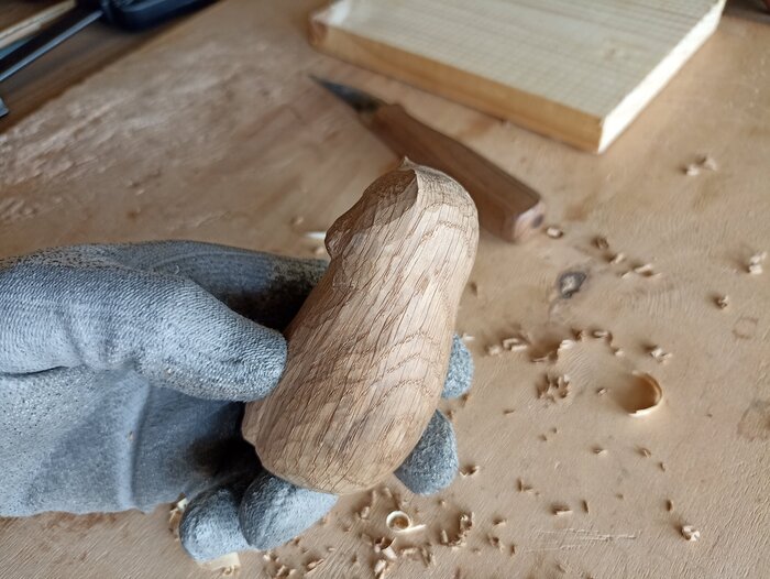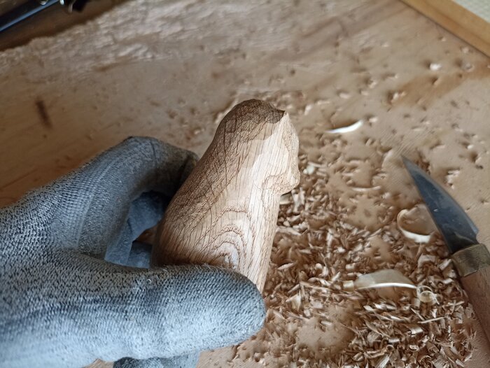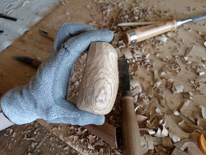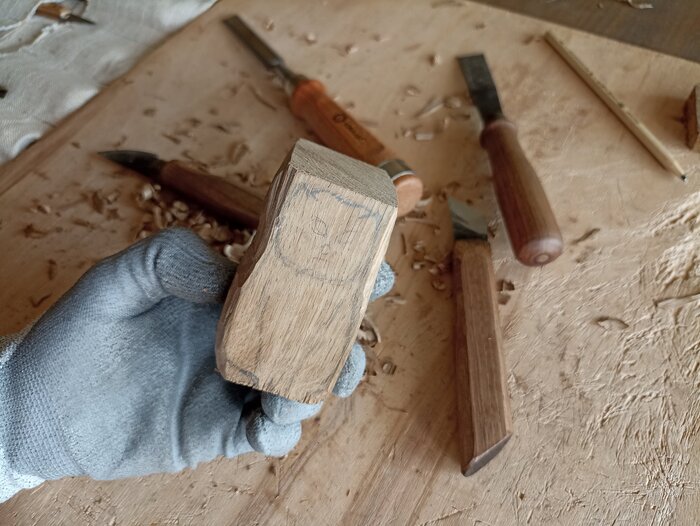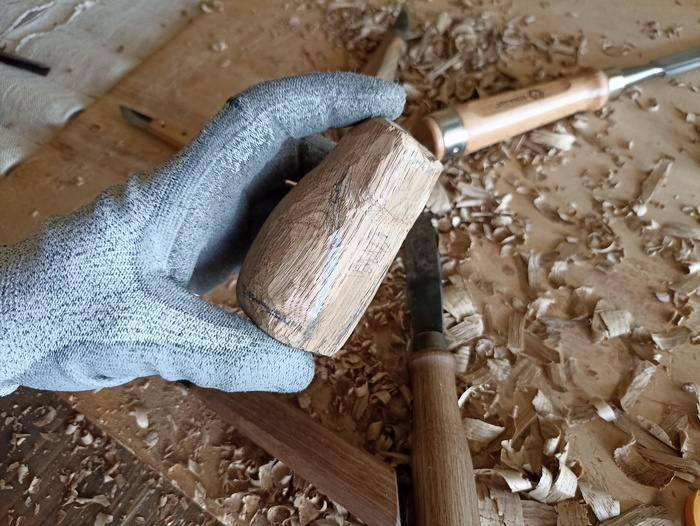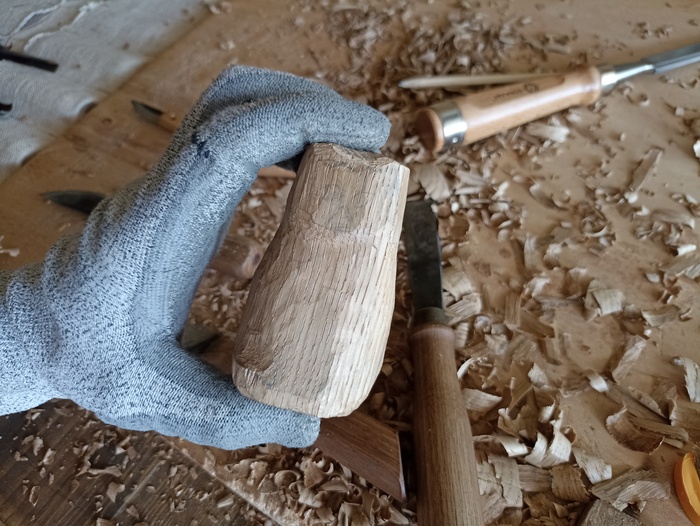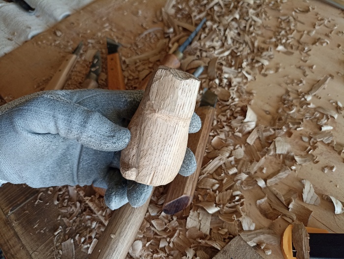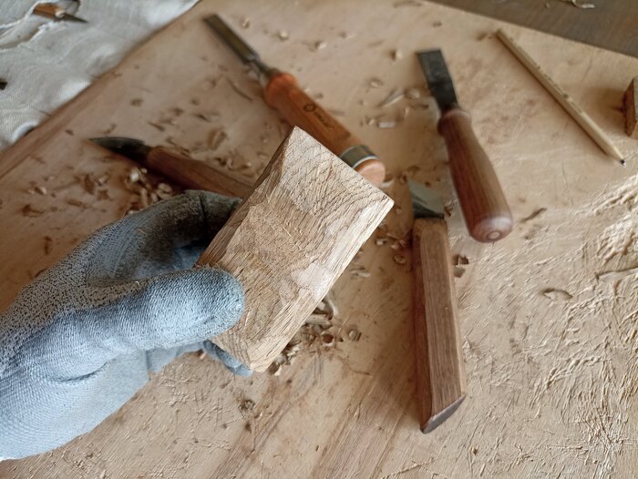 Для резьбы выбрал древесину дуба, как у меня бывает, когда режу первый раз, беру дерево попроще/кривее/некрасивее. Тут был дубовый брусочек, очень перекошенный, к сожалению этот перекос "съел" большую часть мануловой упитанности.