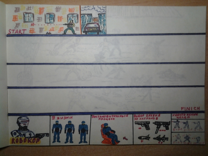 Это из серии игр для денди,денди у меня не было,а играть хотелось,рисовал игру с уровнями и представлял ка прохожу её,таких нарисованных игрушек было много,но жаль не сохранились.