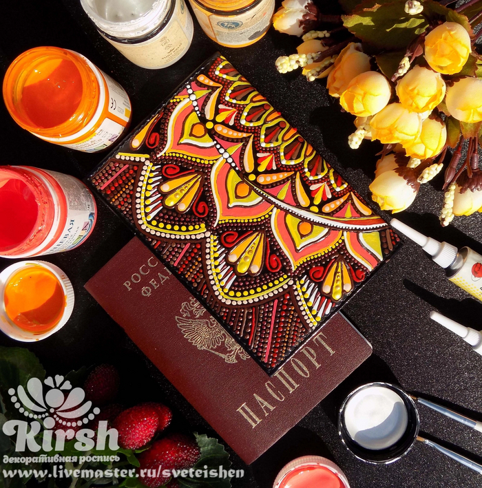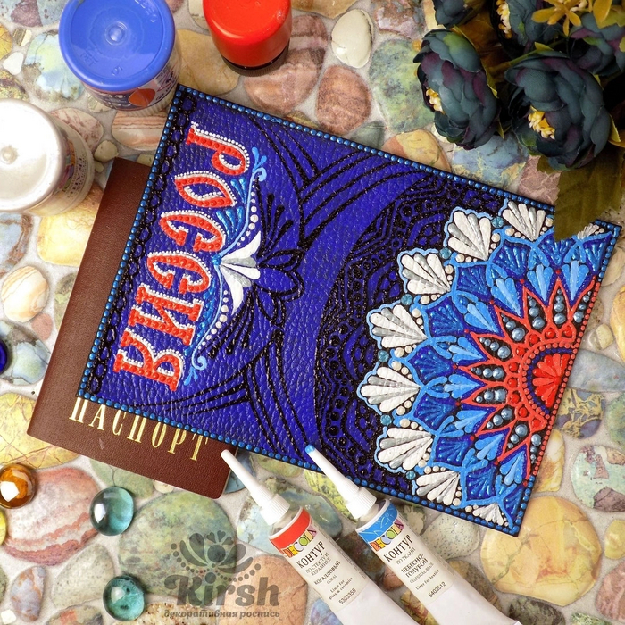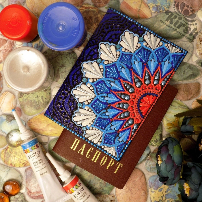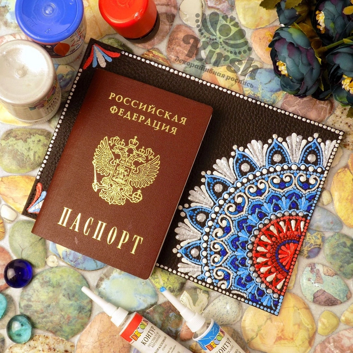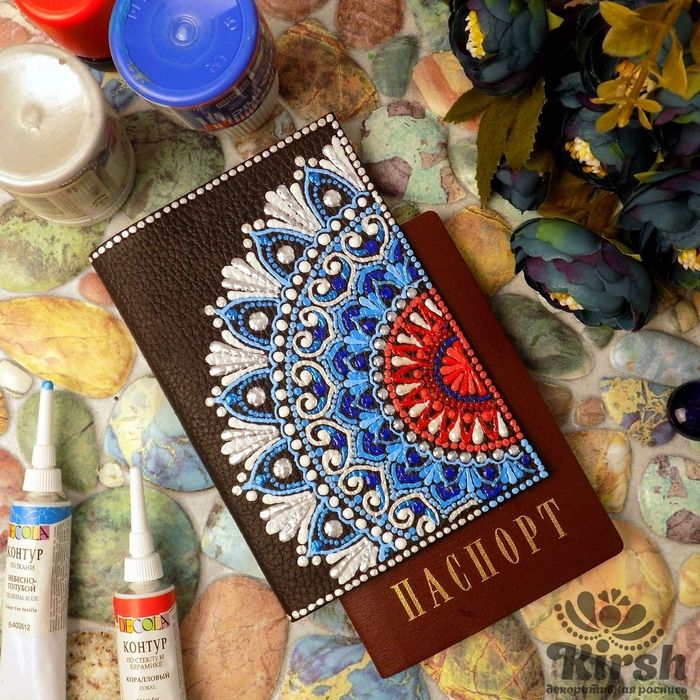 Рисую на кожаных обложках для паспорта акриловыми красками и контурами для кожи и ткани, покрываю полиуретановым лаком в 3 слоя для защиты от истирания, воды.