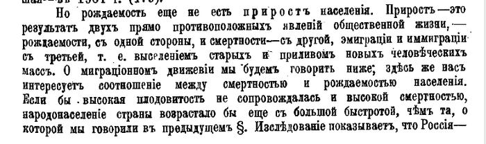 "Но рождаемость еще не есть прирост населения. Прирост - это результат двух прямо противоположных явлений общественной жизни - рождаемости, с одной стороны, и смертности - с другой, эмиграции и иммиграции с третьей, т.е. выселением старых и приливом новых человеческих масс. О миграционном движении мы будем говорить ниже; здесь же нас интересует соотношение между смертностью и рождаемостью населения. Если бы высокая плодовитость не сопровождалась и высокой смертностью, народонаселение страны возрастало бы еще с большой быстротой, чем та, о которой мы говорили в предыдущем §. Исследование показывает, что Россия - не только страна высокой плодовитости, но и огромной смертности, - такой, какая не наблюдается ни в какой другой мало мальски цивилизованной стране Европы.