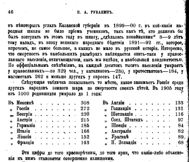 ...Следующая табличка показывает то место, какое занимает Россия среди других народов земного шара по смертности своих детей. В 1905 году из 1000 родившихся умирало до одного года: