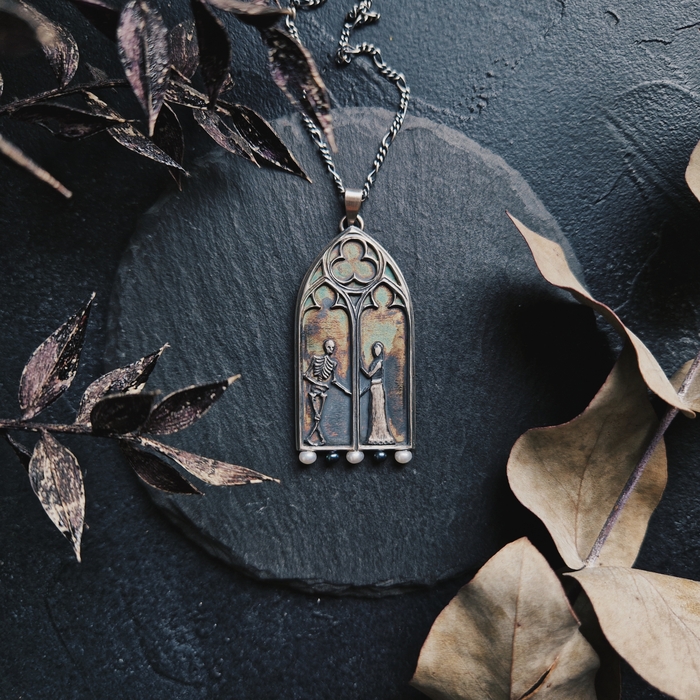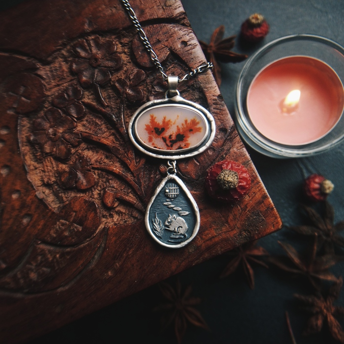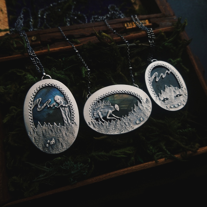 Полно вещей "на витрине", которые я готова сделать на заказ, есть в наличии некоторое количество нежно любимых мною кинжалов, и я сделала мини-серию кулонов, вдохновленных околосредневековыми красивостями и музыкой sylva, которой я подарила один из них.