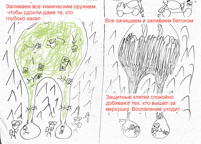 Помним горную деревушку, где не получалось всё зачистить из-за узких тропинок? Так вот после того, как мы провели «бомбежку», «химическую атаку» и залили всё до верха «бетоном», вся органика в каналах «по идее» подыхает, а кисту организм задушит своей иммунной системой, как обычный прыщ где-нибудь на заднице.