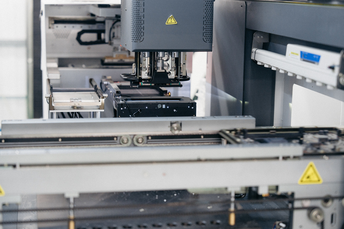 Сам процесс монтажа начинается с печатной платы. Многослойный текстолит вместе с медными проводниками — пустая печатная плата загружается в магазин и далее перемещается в принтер нанесения паяльной пасты.