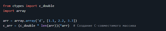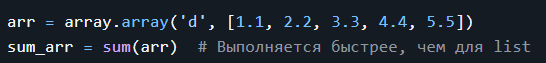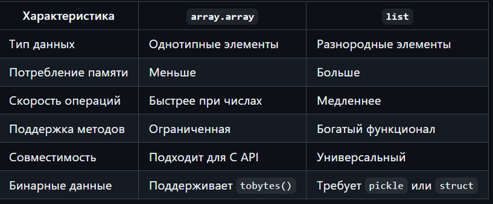Если требуется передавать массив данных в C или взаимодействовать с ctypes и struct, array.array значительно упрощает задачу. Массив array.array хранит данные в компактном виде, что делает его удобным для передачи в нативные C-функции и API, которые ожидают последовательности чисел в виде непрерывного блока памяти.
