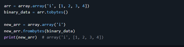 Если необходимо хранить и передавать числовые данные в компактном бинарном формате, array.array предоставляет удобные методы tobytes() и frombytes(). Эти методы позволяют легко конвертировать массив в последовательность байтов и обратно без необходимости дополнительных преобразований, как это требуется для списков.