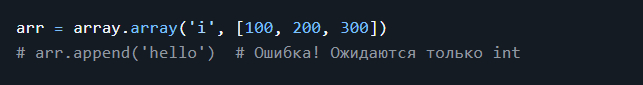 Если заранее известно, что требуется хранить только один тип данных, использование array.array гарантирует отсутствие ошибок, связанных с разнородными элементами.