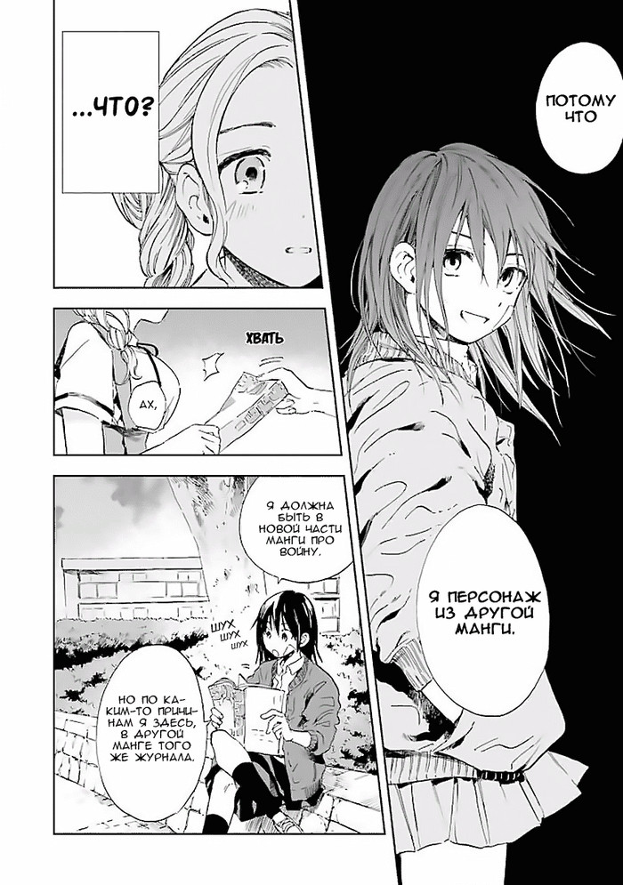 Девушка из военной манги вдруг попала в гаремный ромком. Что из этого вышло и повествует данный сингл. К слову, один из лучших что я видел.