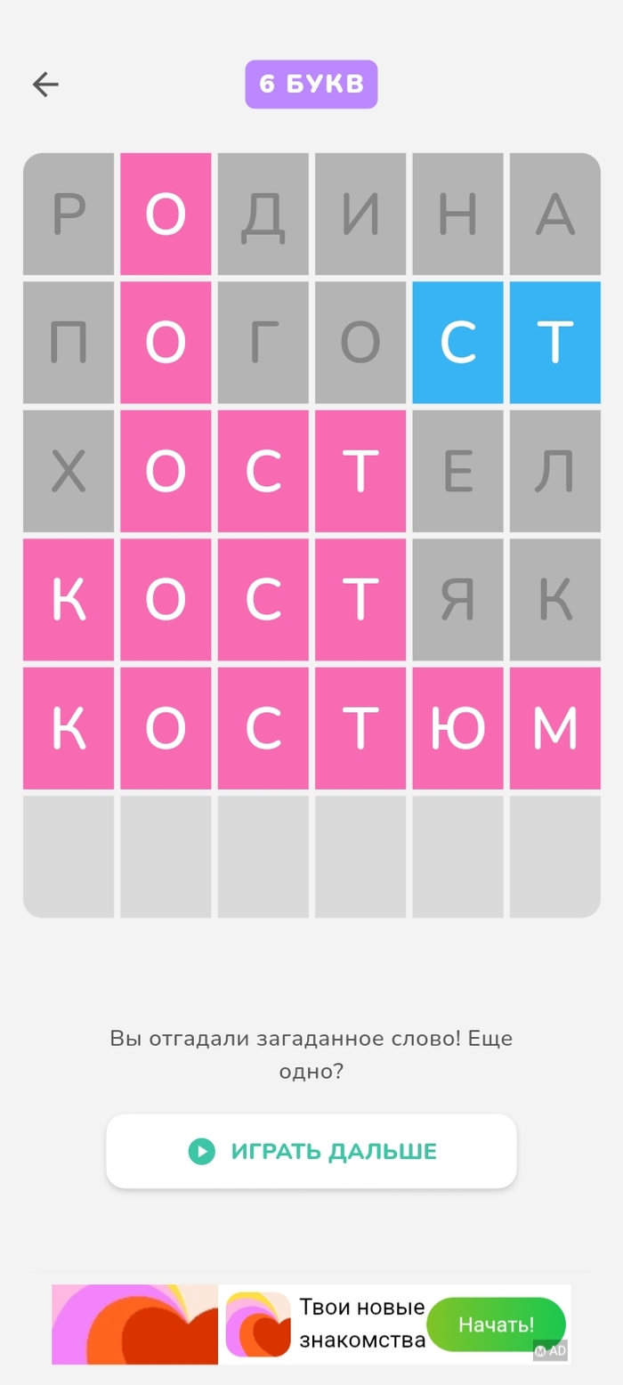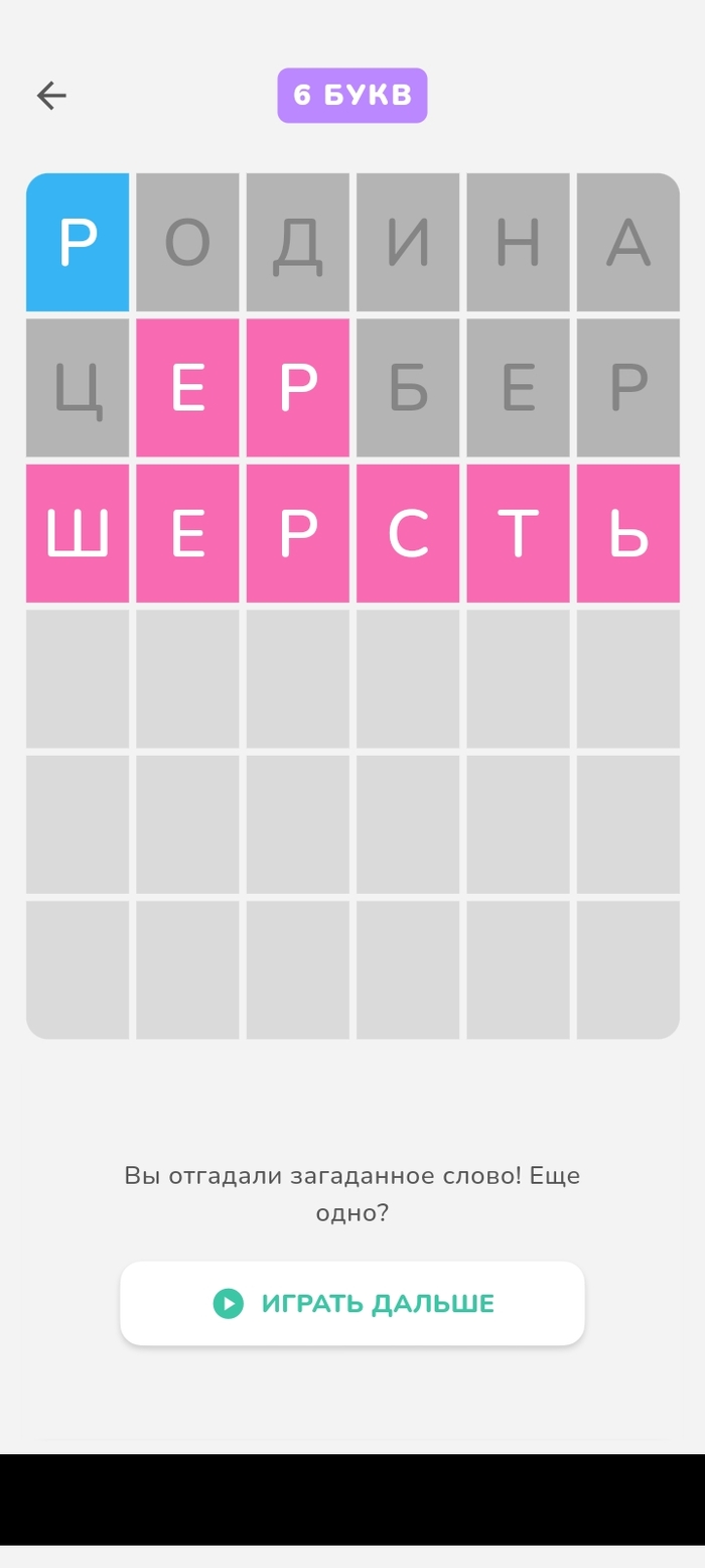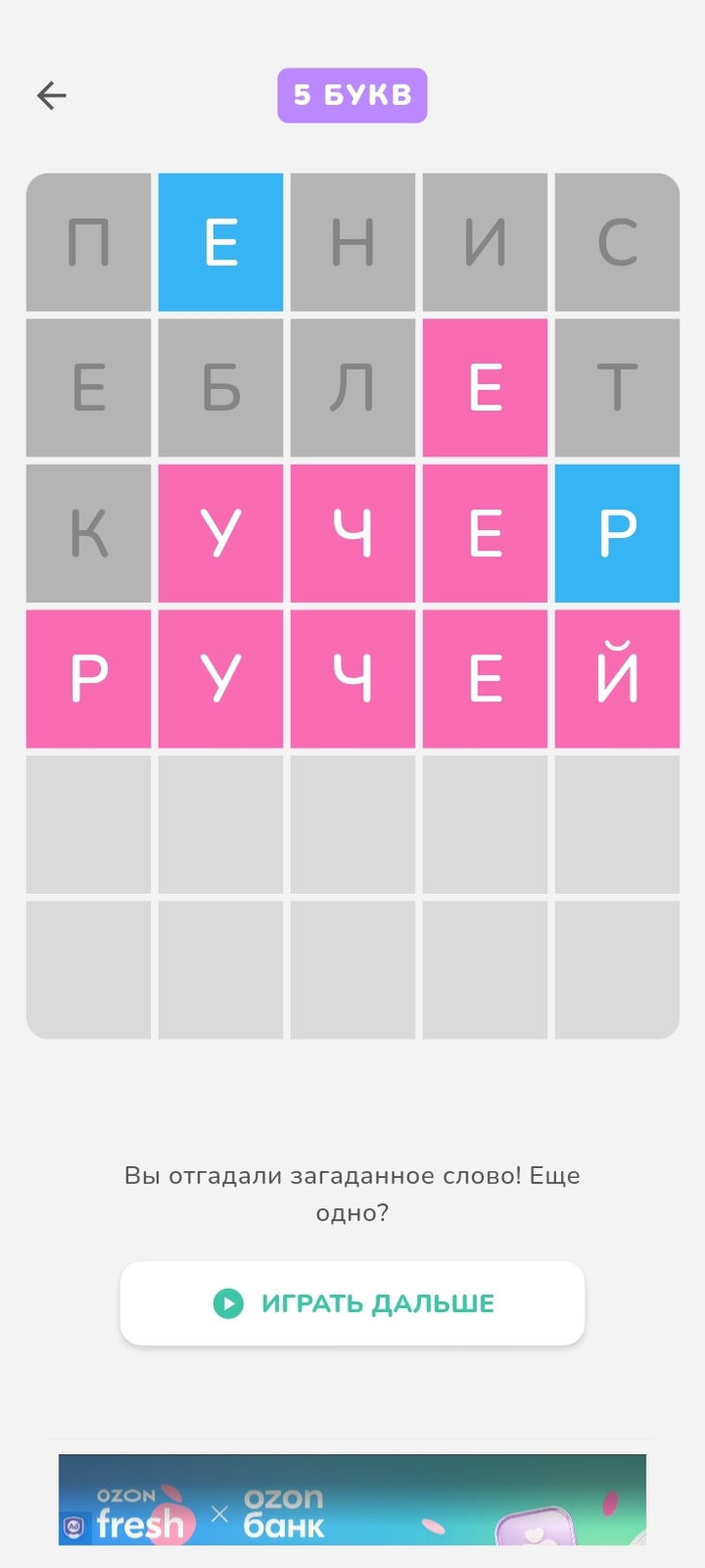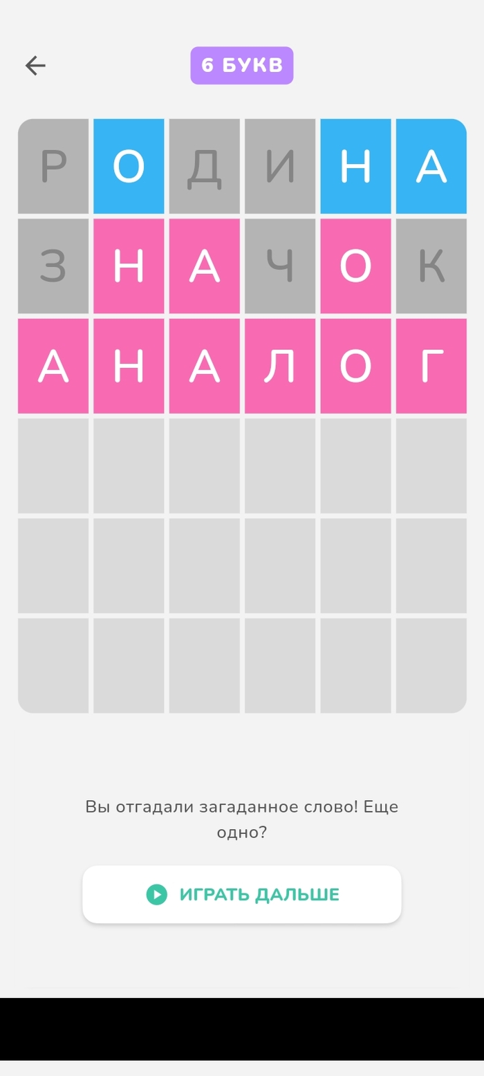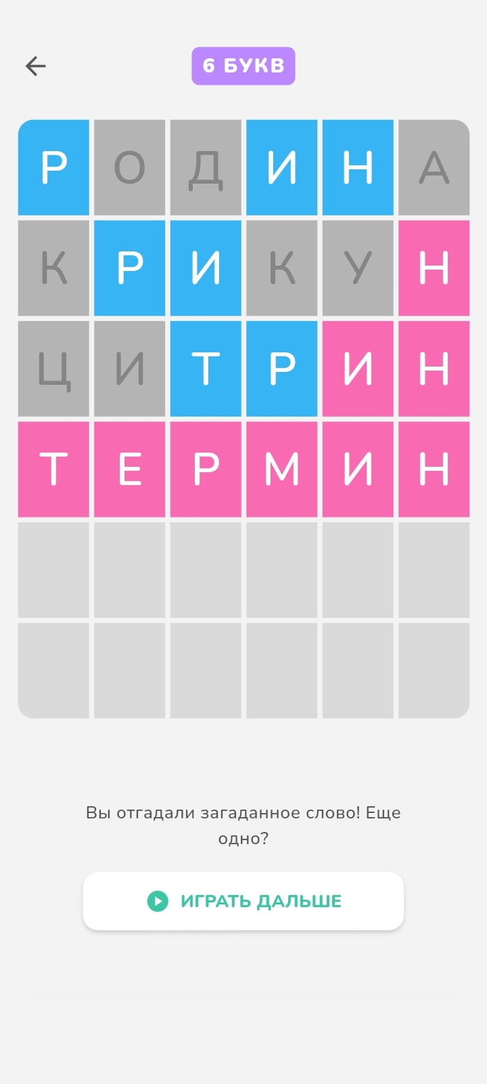 Напоминаю правила новичкам: если в вашем слове присутствует буква искомого слова - она обозначается голубым. Если она стоит на своём месте - розовым. С каждым ходом вы, используя эту информацию, приближаетесь к правильному ответу.