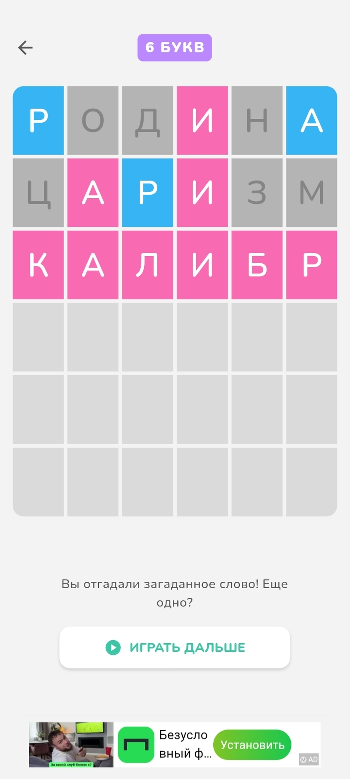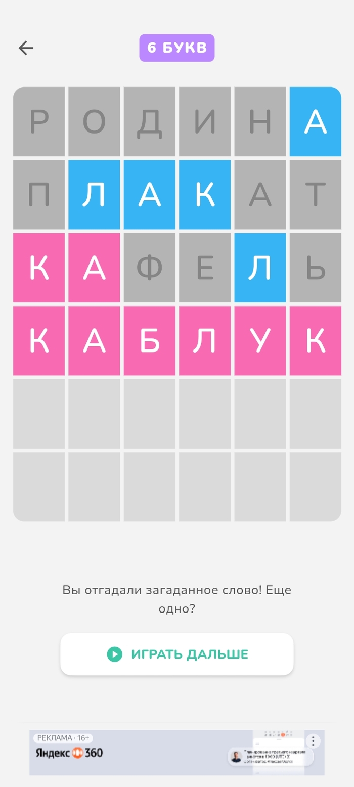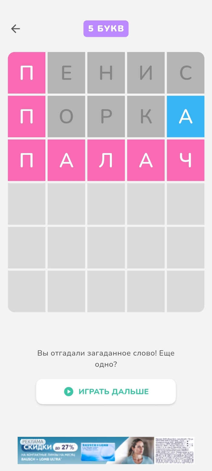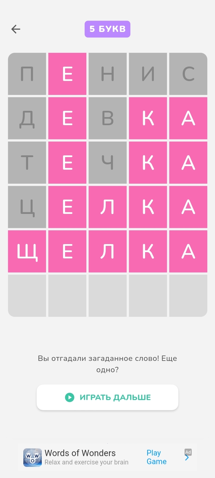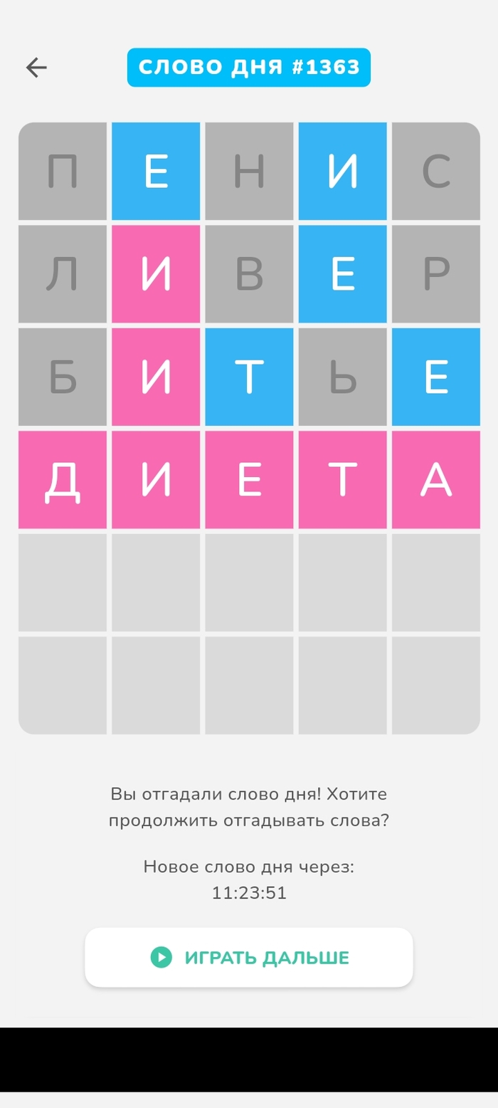 Напоминаю правила новичкам: если в вашем слове присутствует буква искомого слова - она обозначается голубым. Если она стоит на своём месте - розовым. С каждым ходом вы, используя эту информацию, приближаетесь к правильному ответу.