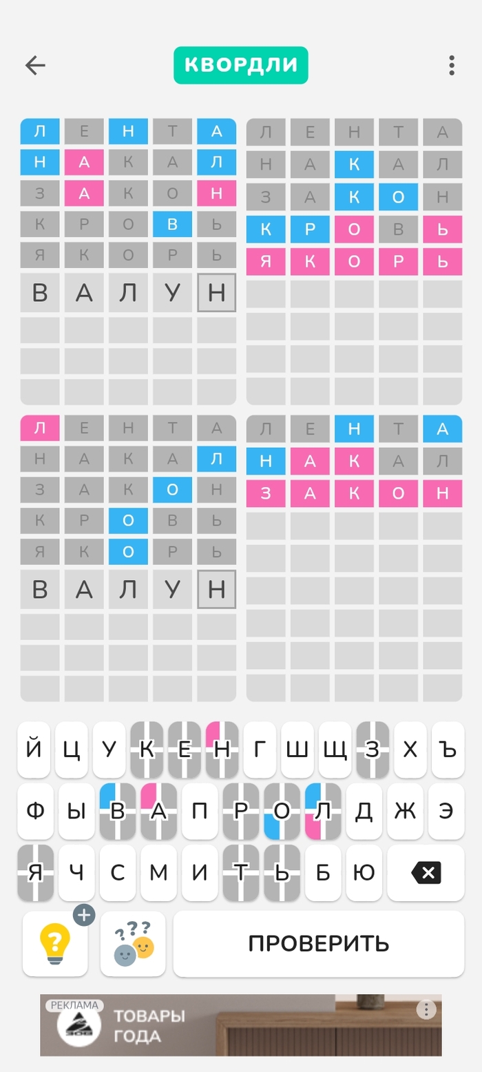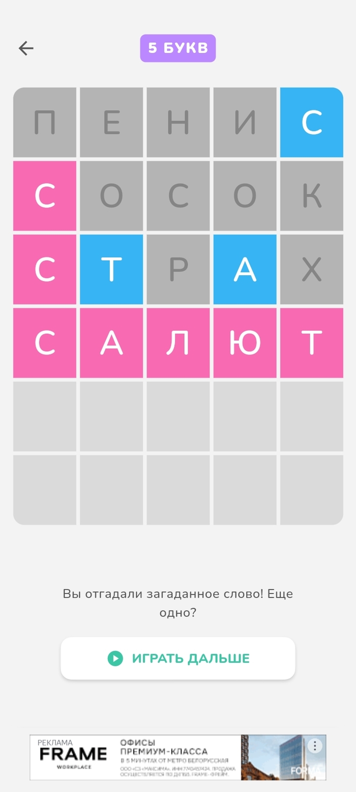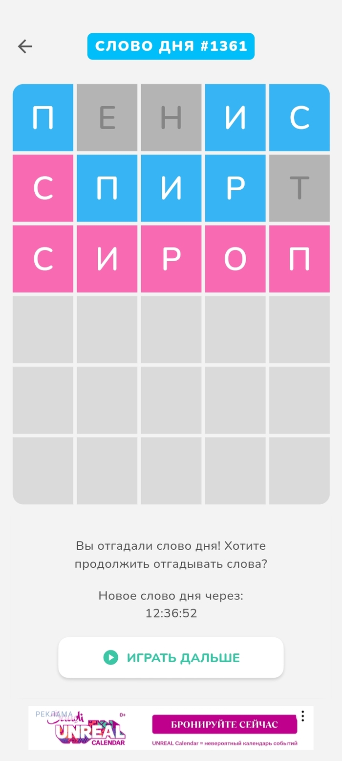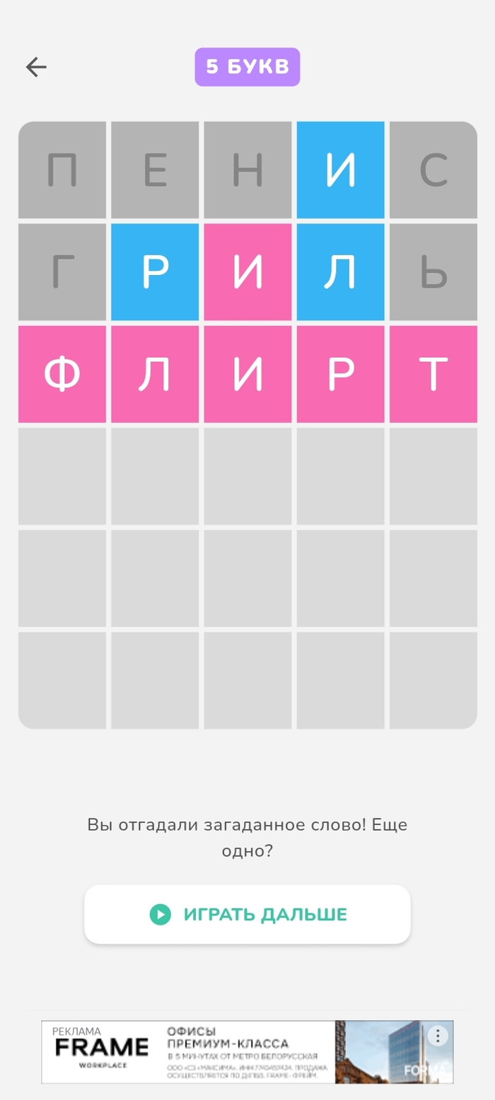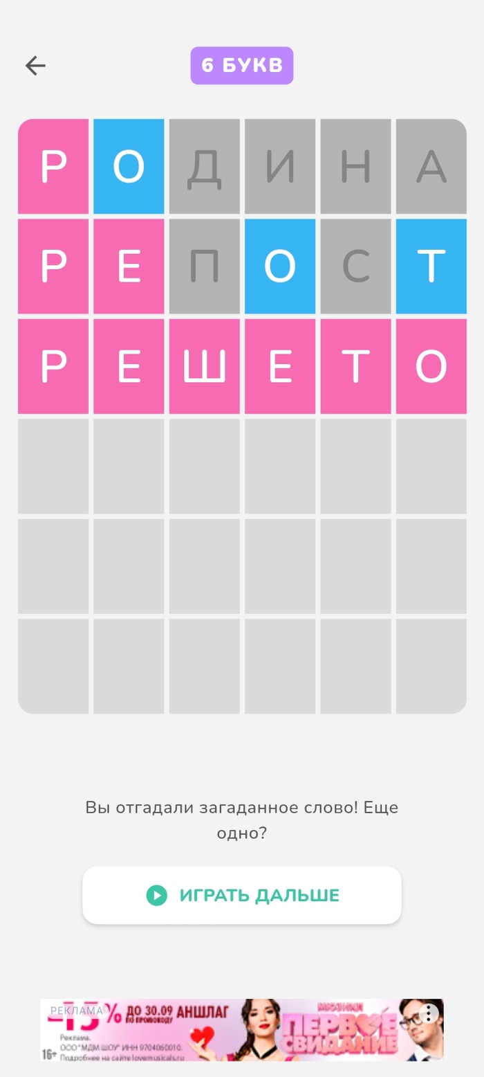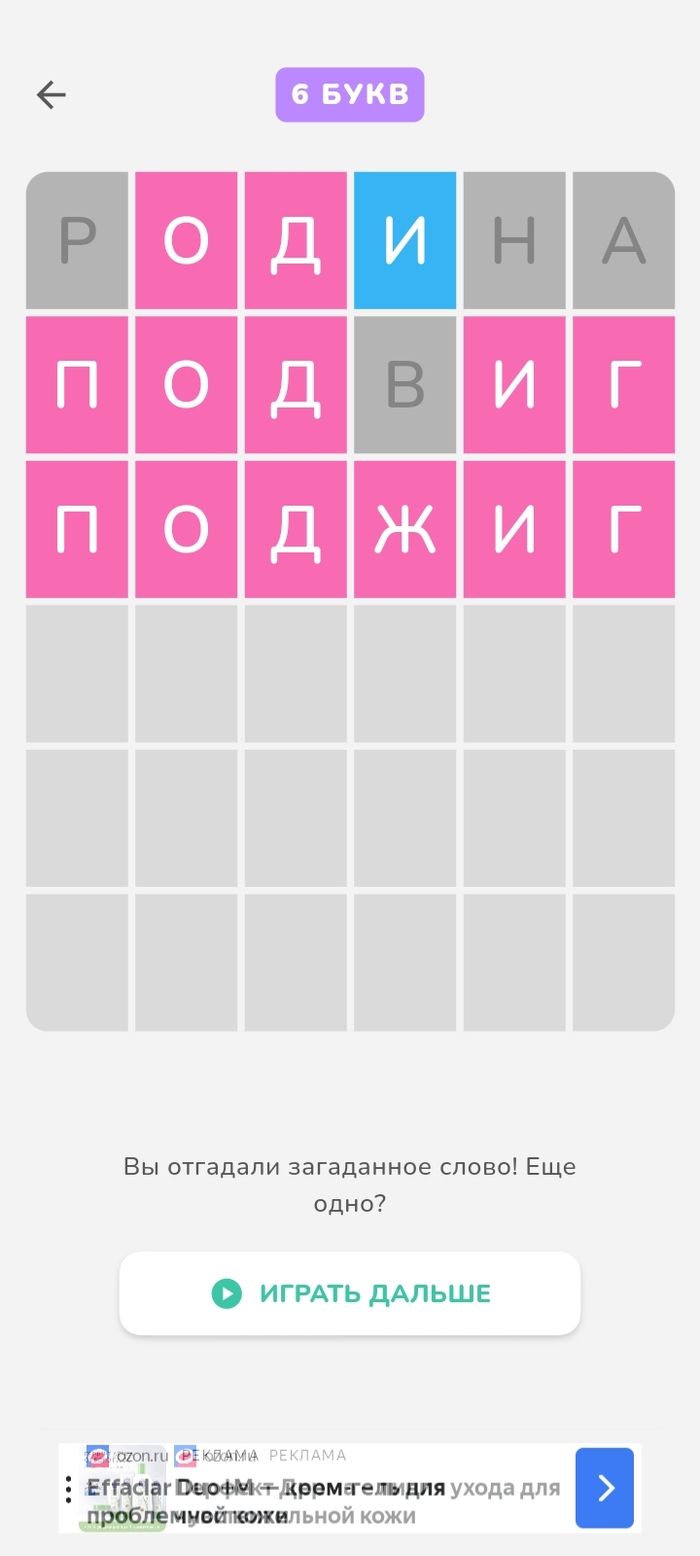 Напоминаю правила новичкам: если в вашем слове присутствует буква искомого слова - она обозначается голубым. Если она стоит на своём месте - розовым. С каждым ходом вы, используя эту информацию, приближаетесь к правильному ответу.