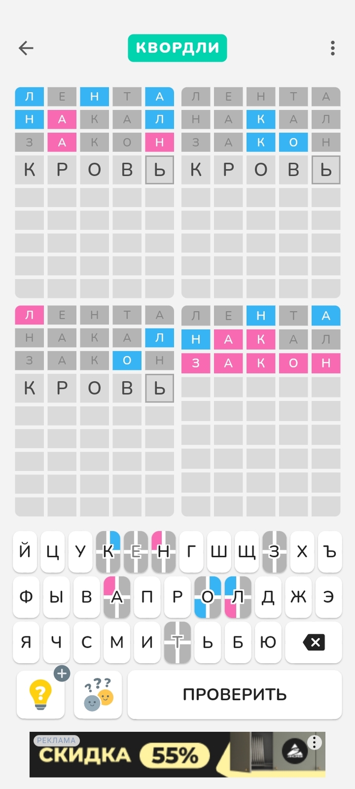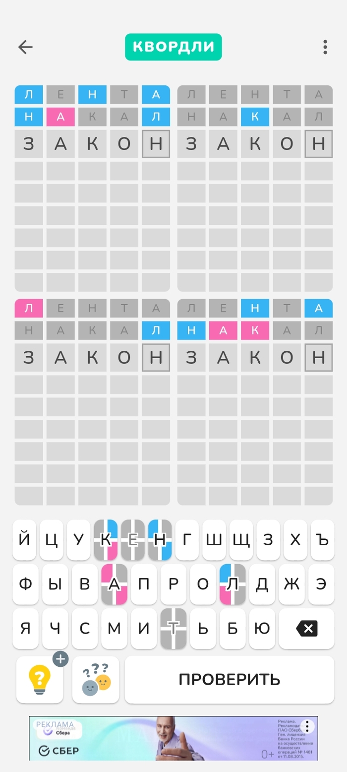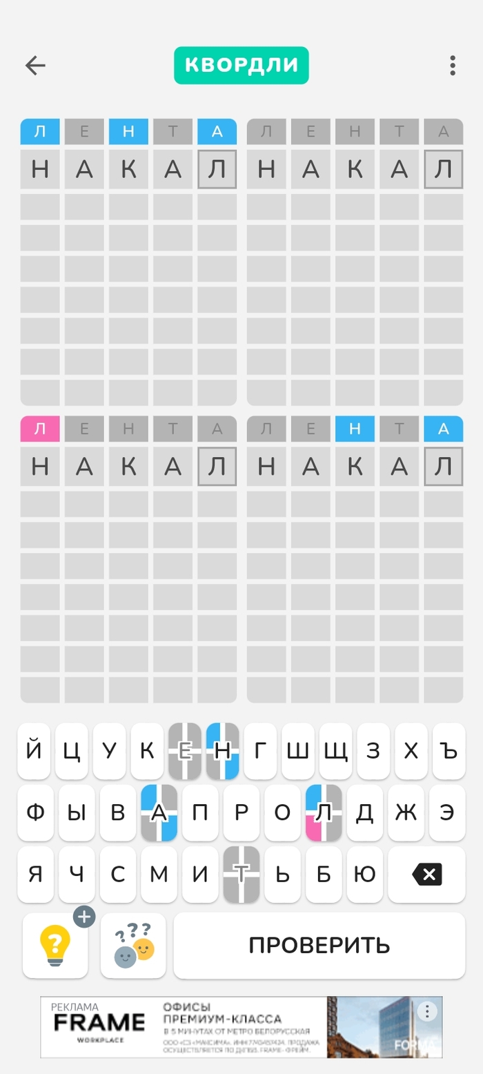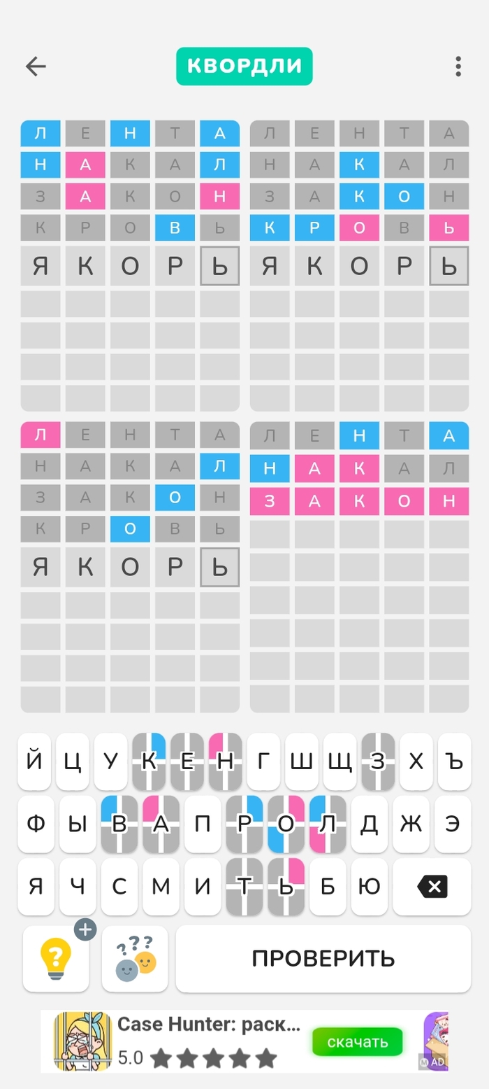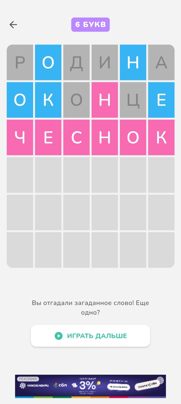 Напоминаю правила новичкам: если в вашем слове присутствует буква искомого слова - она обозначается голубым. Если она стоит на своём месте - розовым. С каждым ходом вы, используя эту информацию, приближаетесь к правильному ответу.