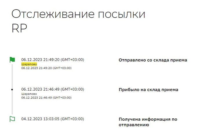 Сегодня уже 11 декабря, товар так и не пришел. Я начал разбираться в ситуации и позвонил в начале магазину, который отправил данный товар - они подтвердили, что 4 декабря товар был отправлен, 6 декабря он прибыл на склад приема и как вы думаете по какому адресу? Бинго, Шарапово (Одинцовский район) - это гарантировано означает, что меня ждут проблемы с доставкой товара и по всей видимости подарка на Новый год не будет, но "вы держитесь и ожидайте поиска потерянного товара".
