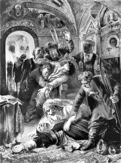 Так как сыновей у Федора не было, в случае его смерти престол мог перейти еще одному сыну Грозного, Дмитрию, родившемуся от последнего брака Ивана с Марией Нагой. Согласно церковным законам того времени, повторный брак был крайне нежелательным мероприятием и допускался либо в случае смерти одного из супругов, либо, если брак получался бездетным, либо в случае пострига супруги в монастырь. При чем даже в таких случаях жениться можно было не более трех раз. У Ивана же было около 8 жен (точное число до сих пор является предметом исторического спора). После смертей первых трех жен царь получил разрешение от церкви на четвёртый брак, однако все последующие браки благословлены не были. В глазах церкви царевич Дмитрий был незаконно рожденным и не имел право претендовать на престол. После смерти Грозного он вместе с матерью был отправлен на постоянное жительство в город Углич. 15 мая 1591 года Дмитрий Иоаннович был найден лежащим на земле с перерезанным горлом в Угличском кремле. После обнаружения тела по приказу Марии Нагой забили в набат, который собрал жителей на главной площади города. Царица объявила о случившемся и обвинила в убийстве Осипа Волохова, Никиту Качалова и Данилу Битяговского, сына дьяка Михаила, присланного надзирать за опальной царской семьей, которые якобы выполняли приказ Бориса Годунова. В Угличе вспыхнули беспорядки и разъярённая толпа тут же растерзала всех обвиненных в убийстве.