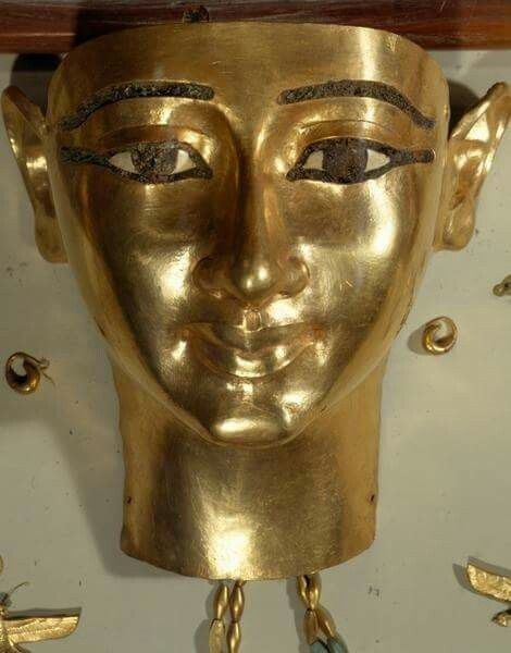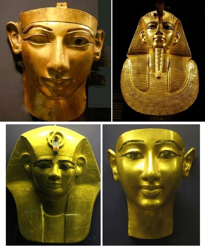 Изначально, как и у маски Тутанхамона у этой маски имелся золотой полосатый платок немес, покрывающей голову фараона и урей в виде змеи. Куда же они делись? Собственно, туда куда и мумия царя, и внутренний саркофаг – они просто сгнили во влажной атмосфере, поскольку были сделаны из органики (дерева, например) и покрыты тончайшими пластинами золота. Вот остатки этих пластинок мы и видим над обручем на старом фото. Кроме того, нам хорошо видны и крепления, на которых немес крепился к маске.